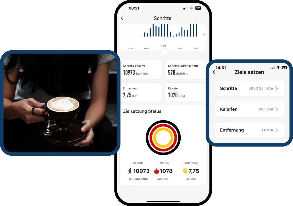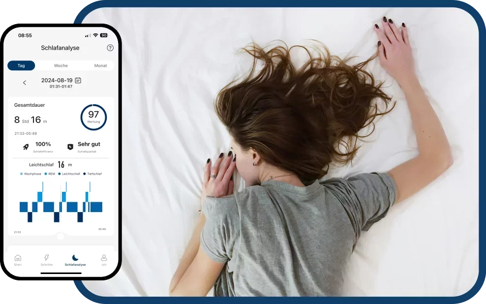 Dein Blaupunkt®-Ring bietet dir umfassende Einblicke in Schlafmuster, Qualität und Regelmäßigkeit. Er erfasst deine Schlafphasen, analysiert Bewegungen und unterstützt dich dabei, individuelle Schlafgewohnheiten zu optimieren. Dein Blaupunkt®-Ring informiert dich morgens über deine Schlafqualität mit genauer Analyse nach Tiefschlaf, Leichtschlaf und REM-Schlaf.